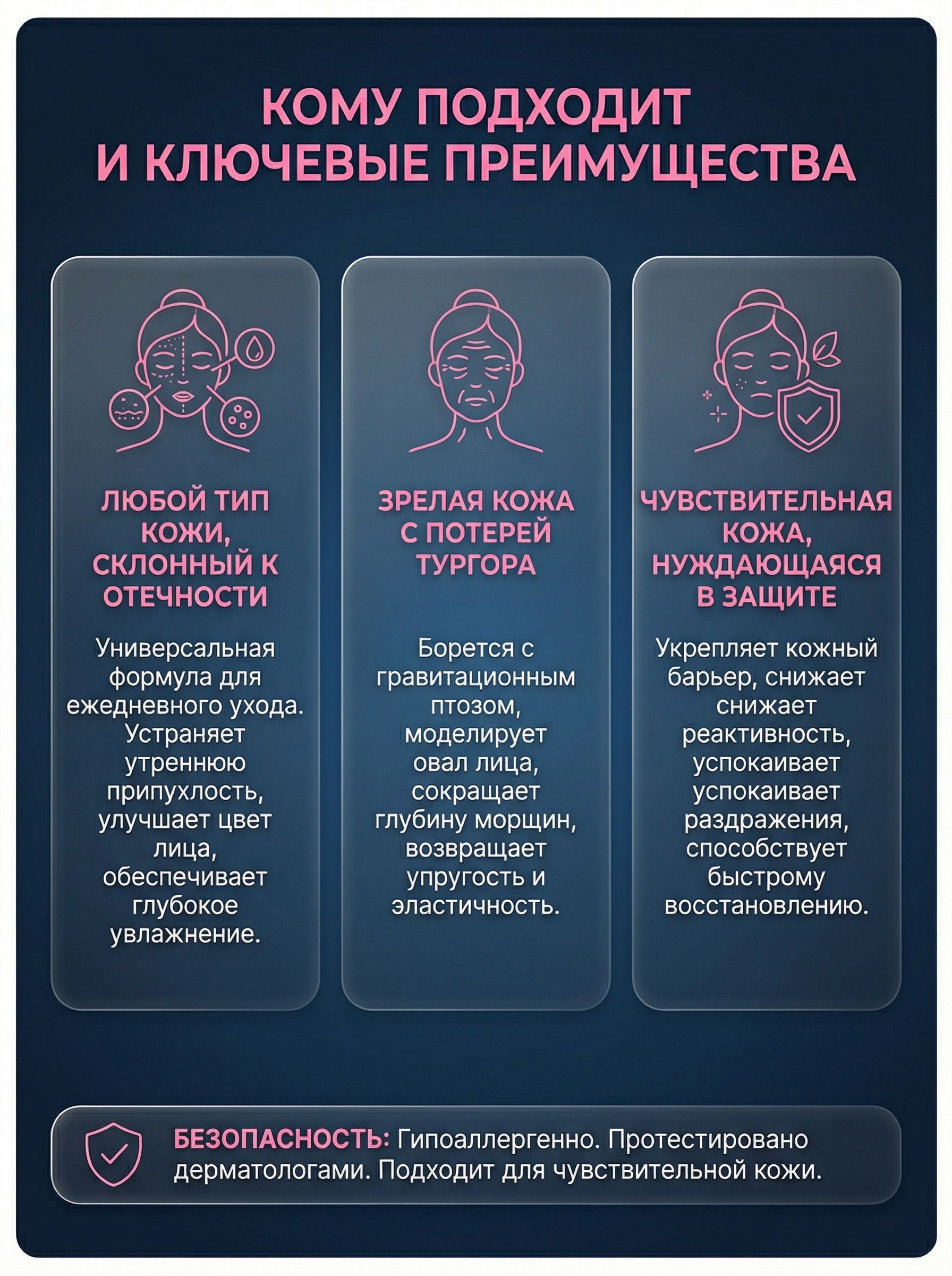 Крем предназначен для улучшения контура лица и подтяжки кожи любого типа, склонной к отёчности.