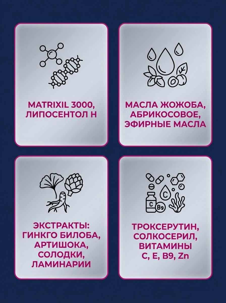 масло-активы: жожоба, абрикосовое; Липосентол Н, Matrixyl 3000, водная вытяжка молок лосося, троксерутин, экстракты: гинкго билоба, артишока, корня солодки, сапропеля, ламинарии; солкосерил, эфирные масла: кипариса, герани, пачули; витамины: С, Е, В9; микро-элементы: Zn.