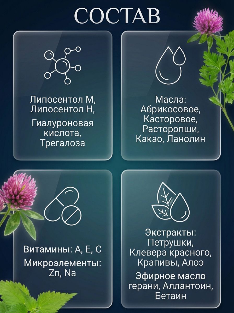 экстракты: петрушки огородной, клевера красного, крапивы; масло какао, экстракт алоэ,