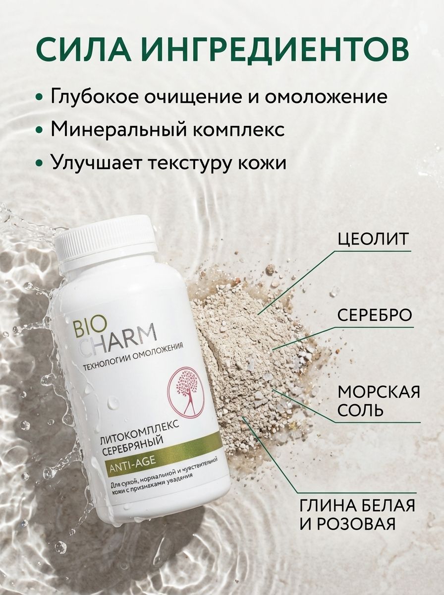 Литокомплексы Biocharm «Технологии омоложения» очищают кожу от загрязнения и собственных ороговевших клеток, повышают защиту от бактерий и обогащают кожу микроэлементами (кремний, серебро, медь, цинк, калий, магний), необходимыми для обновления клеток и укрепления антиоксидантной защиты.